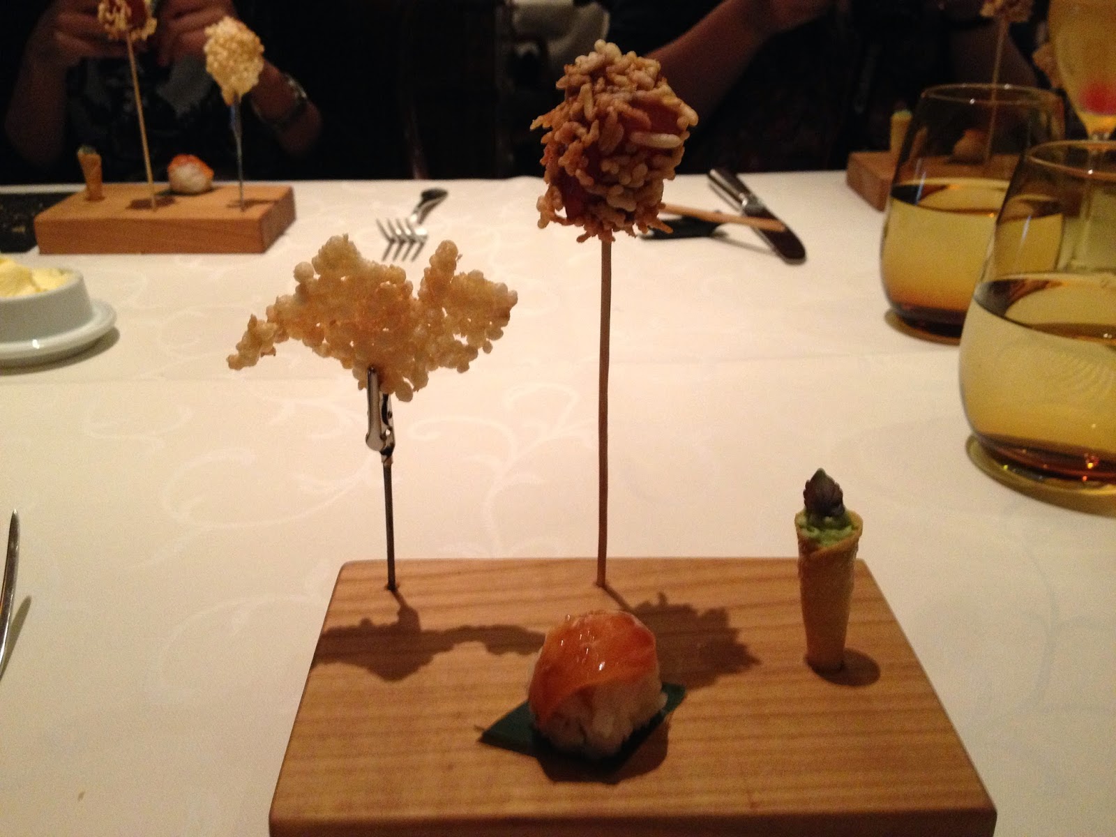 Before we got our starter we were treated to three amuse bouche. They were delicious, and actually better than the dessert, something I thought I would never hear myself say. My favourite one was the second one, which had wonderful Asian flavours. The sushi was delicious and I liked the wasabi and crème fraiche in a crispy cone.